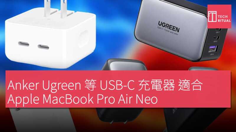 Apple 最新 MacBook 機型發佈前,隨機附送標準 USB-C 電源適配器,但 M5 MacBook 系列起,隨機電源選擇多樣化,新款 MacBook Neo 只配 20W 充電器。歐盟及英國地區最新 MacBook 更不附送充電器。用戶可考慮第三方優質 USB-C 充電器替代。 充電器種類多樣,包括壁插式、桌面式、旅行式及延長線式。購買時應注意 PD (Power Delivery) 協議、功率瓦數、端口數量及便攜性。