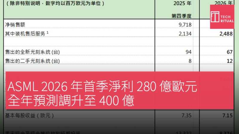 ASML 2026 年首季淨利 280 億歐元 全年預測調升至 400 億