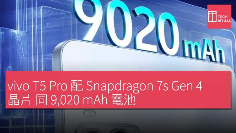 vivo T5 Pro 配 Snapdragon 7s Gen 4 晶片 同 9,020 mAh 電池