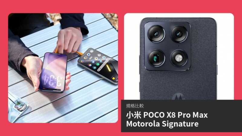整體而言,Motorola Signature 規格更全面,尤其相機與軟件支援優勝;POCO X8 Pro Max 性價比高,續航突出。若預算有限或注重電池,選 POCO;若追求頂尖攝影與耐用性,Motorola 更佳。最終選擇視個人需求而定。