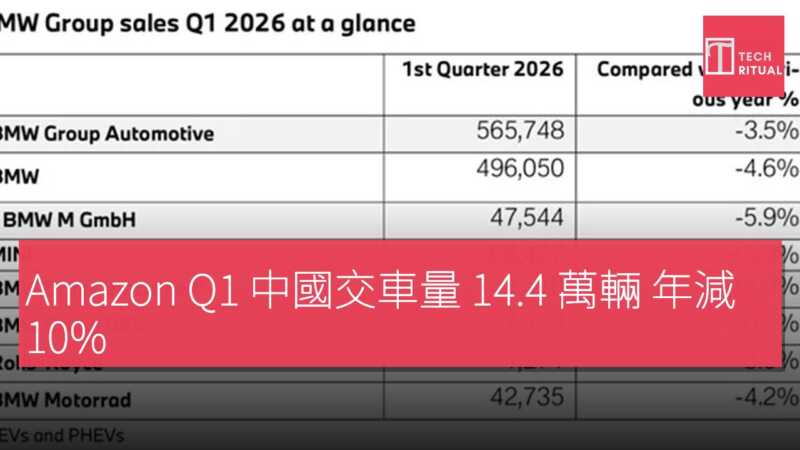 寶馬集團近日發佈 2026 年第一季度全球交付出爐,中國市場表現疲軟,一季度交付出貨 14.4 萬輛,同比大跌 10%。從全球整體表現來看,寶馬一季度三大品牌合共交付出貨 56.57 萬輛,同比下滑 3.5%,儘管面對美國市場疲軟,寶馬整體表現仍優於 Porsche 及 Audi 等主要競爭對手。