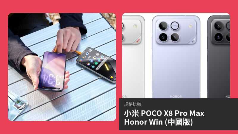 小米 POCO X8 Pro Max 與 Honor Win (中國版) 是兩款定位中高階的 5G 智能手機,前者已正式發佈,後者預計於 2026 年初推出。本文將透過規格對比與詳細分析,客觀比較兩者在屏幕、效能、攝影、連接性等方面的表現,幫助讀者了解哪款更適合日常使用、遊戲或專業攝影需求。無論追求電池續航還是頂級處理器,這場比較將揭示各自優勢。