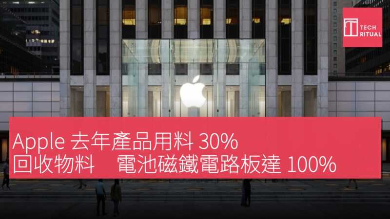 Apple 去年實現產品包裝完全去除塑膠的目標,所有 Apple 產品現均採用 100% 纖維基包裝,用戶可在家中回收。產品本身亦大量使用回收物料,公司去年出貨產品整體回收物料比例達 30%。在三項特定範疇,回收物料使用率更達 100%:所有 Apple 自家設計電池採用 100% 回收鈷;所有磁鐵使用 100% 回收稀土元素;所有 Apple 自家設計印刷電路板使用 100% 回收金鍍層及錫焊料。