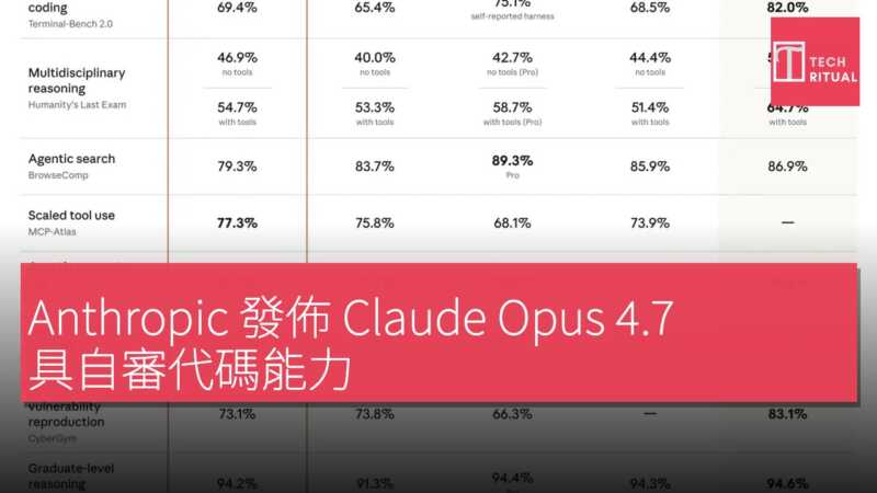 Anthropic 發佈 Claude Opus 4.7 具自審代碼能力 軟件工程基準得分升至 87.6%