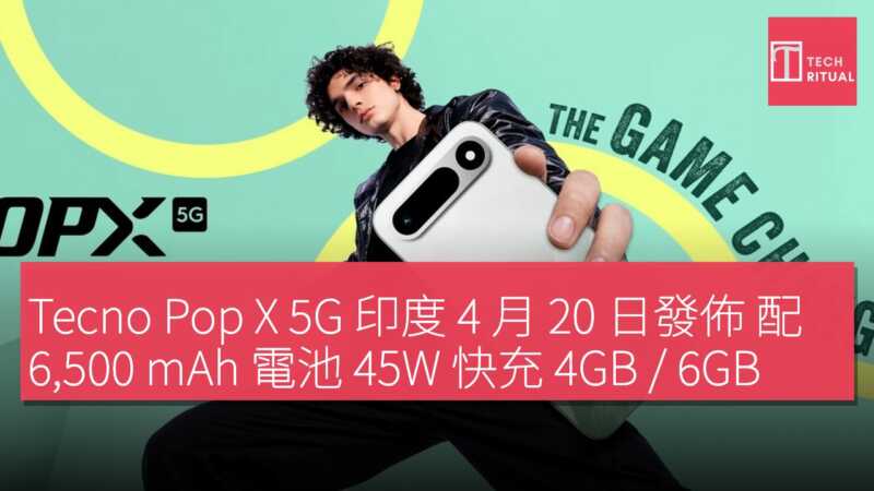 Tecno 宣布將擴展 Pop 系列智能手機產品線,即將推出 Pop X 5G 型號,該機將於 4 月 20 日在印度透過 Amazon.in 平台發售。Tecno 與 Amazon 尚未公布 Pop X 5G 的售價,但雙方已透露部分規格細節,Amazon 甚至公開了機身顏色選項。該機搭載 6,500 mAh 電池,並支援 45W 快充。雖然處理器型號未有披露,但 Amazon.