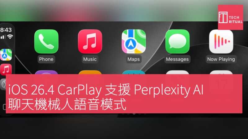 Apple 自 iOS 26.4 起,支援在 iPhone 透過 CarPlay 使用 AI 聊天機械人應用程式。ChatGPT 成為首個在 iOS 26.4 發佈後迅速上線的 AI 應用程式。現在,第二款 AI 聊天機械人 Perplexity 亦已加入支援。Perplexity 在 CarPlay 上需啟用語音模式,類似 ChatGPT 的 CarPlay 應用程式,同樣以語音聊天為設計核心。