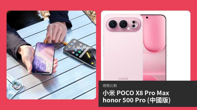 綜合比較,小米 POCO X8 Pro Max 在屏幕 (更大、更亮)、電池續航 (8,500mAh + 100W)、防水 (IP68) 和觸控表現上佔優,適合遊戲玩家、長時間使用者及戶外愛好者;honor 500 Pro (中國版) 則以效能 (16GB RAM、骁龍 8 至尊版)、攝影 (2 億像素 + 長焦)、無線充電和 AI 功能領先,更適合攝影發燒友、重度多工用戶及追求輕薄設計者。