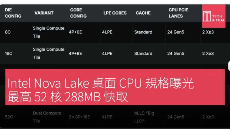 Intel 下一代桌面處理器 Nova Lake(Core Ultra 400)核心配置與 SKU 規格近日全面曝光。這款產品將採用全新架構、最高 52 核心全新 LGA 1954 平臺,並首次引入大容量版本對抗 AMD X3D 技術。