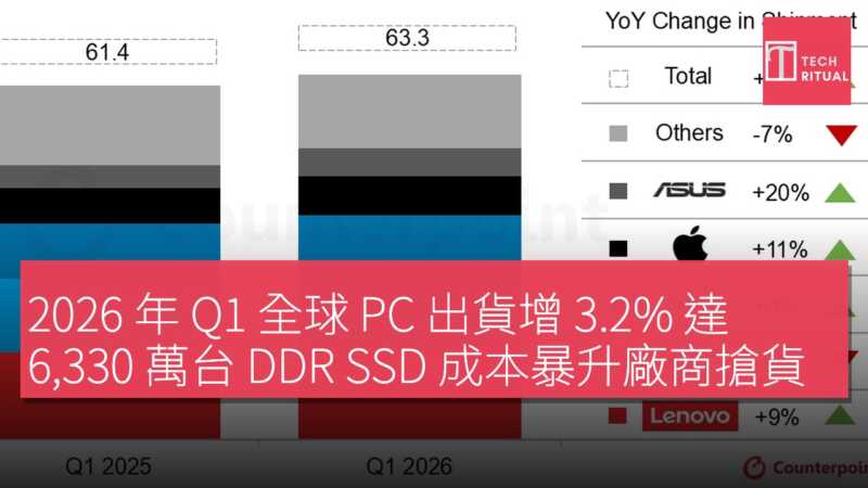 2026 年 Q1 全球 PC 出貨增 3.2% 達 6,330 萬台 DDR SSD 成本暴升廠商搶貨