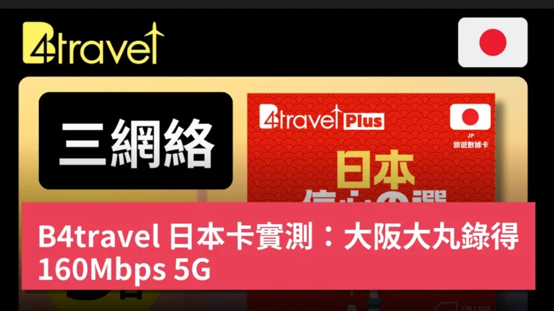 喺大阪大丸測到 160Mbps 5G,呢個測試係由一位 YouTuber 進行,結果顯示 B4travel Plus 三網絡日本卡喺人流密集嘅地區仍能保持高速度。詳細測試可以參考佢嘅影片 YouTuber 實測。