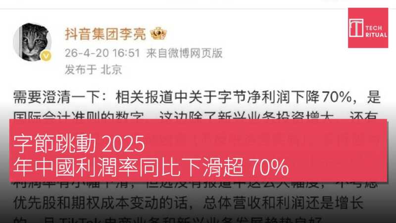 字節跳動 2025 年中國利潤率同比下滑超 70% 李鵬回應指會計準則數字