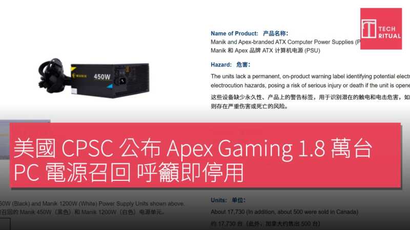 美國 CPSC 公布 Apex Gaming 1.8 萬台 PC 電源召回 呼籲即停用