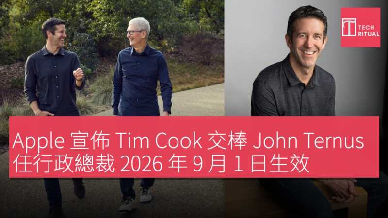 Apple 將於今年稍後進行重大領導層變動,首席執行官 Tim Cook 將卸任,由 John Ternus 接棒。公司表示,交接將於 2026 年 9 月 1 日生效。Tim Cook 自 2011 年領導 Apple 至今,將轉任執行董事會主席。公司指,此決定源於董事會一致通過的長期繼任計劃。Tim Cook 將留任至夏季,監督交接過程。