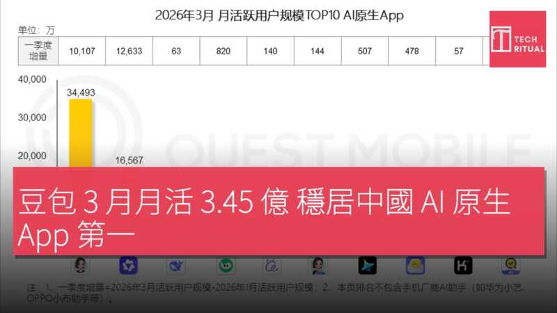豆包 3 月月活 3.45 億 穩居中國 AI 原生 App 第一