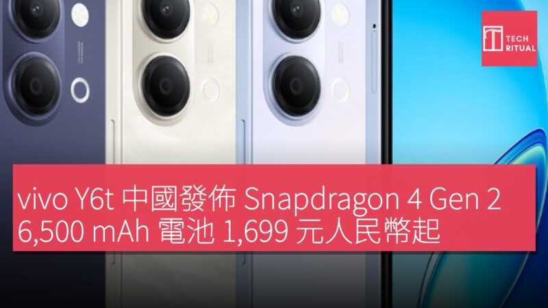 vivo 正式發佈 Y6t 智能手機,搭載 Qualcomm Snapdragon 4 Gen 2 處理器。機身配備 6.74 吋 LCD 屏幕,分辨率為 720×1600,支援 120Hz 更新率。後置 13MP 主鏡頭,前置 5MP 自拍鏡頭。電池容量達 6,500 mAh,支援 15W 有線快充。系統為 Android 16 搭配 OriginOS 6,自家 Y6t 官方圖片顯示側邊電源鍵內置指紋辨識器,支援 5G 網絡及 3.