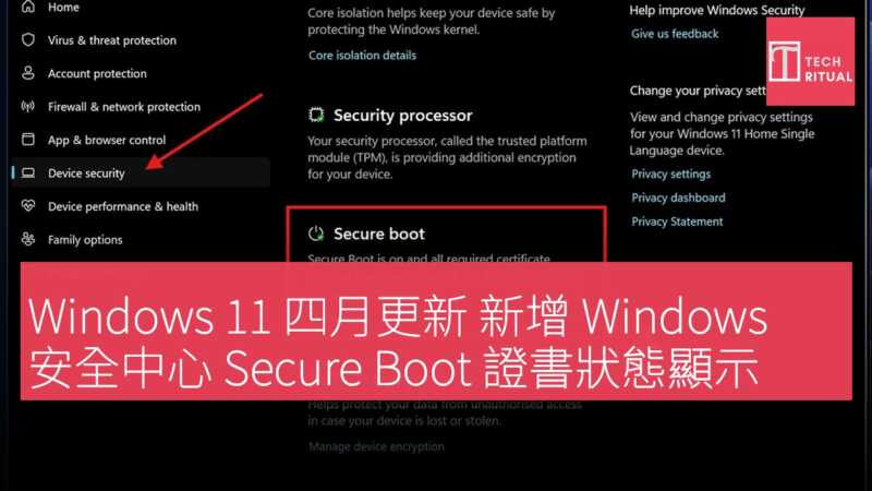 不過,對普通使用者而言,之前一直缺乏直觀、易用的判斷方式來確認自家電腦是否已替換為新證書。此前,想驗證 Secure Boot 2023 證書是否已應用,使用者只能依賴 PowerShell 指令或事件檢視器日誌等相對專業的方法,這並不適合大多數非技術使用者日常操作。而在四月更新後,Windows 安全中心首次直接在介面中呈現 Secure Boot 證書狀態,解決了這一「資訊黑箱」問題。
