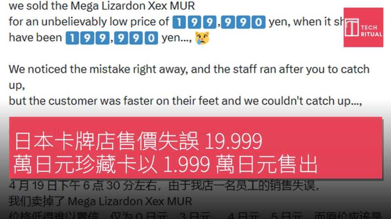 日本東京一家名為 Torekachies 的卡牌店近日發生一件令人啼笑皆非的事件。一名店員在銷售時犯下嚴重失誤,將原價 199,990 日元(約人民幣 10 萬元)的珍稀卡牌,以 19,990 日元(約人民幣 856 元)的低價售予顧客。這款卡牌名為 Mega Lizardon Xex MUR,屬於熱門寶可夢系列,在卡牌愛好者圈子極受追捧,正常市價遠超 100 萬日元。
