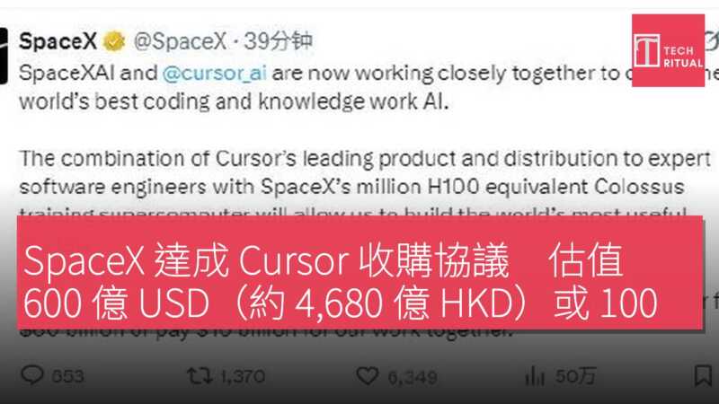 SpaceX 已與人工智能初創公司 Cursor 達成協議,獲得今年晚些時候以 600 億美元收購該公司的權利,或以 100 億美元收購雙方正在合作的項目。SpaceX 當周二在 X 平台發佈的一篇帖子中表示:「SpaceXAI 與 Cursor_AI 正緊密合作,共同打造世界一流的編程與知識工作人工智能。Cursor 的領先產品及其面向專業軟件工程師的分發渠道,結合 SpaceX 的百萬級 H100 等效 Colossus 級計算機訓練系統,將使我們能夠構建世界上最有用的模型。