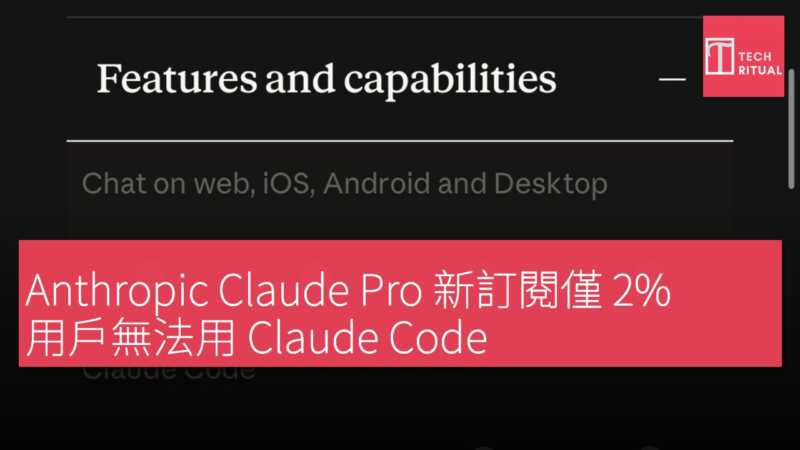 近日有網友留意到,開通 Claude Pro 訂閱時提示不包含 Claude Code 功能,對不少開發者而言,這相當於付費開通訂閱的主要目的就是使用 Claude Code。因此,若除去這項功能,開發者需要支付更高價值的其他套餐。目前 Anthropic 主要提供每月 US$20(約 HK$156)的 Claude Pro 訂閱,以及每月 US$100(約 HK$780)起跳的 Claude Max 訂閱,原先這些訂閱均包含所有付費功能,只不過 Max 訂閱可獲得更高 Claude Code