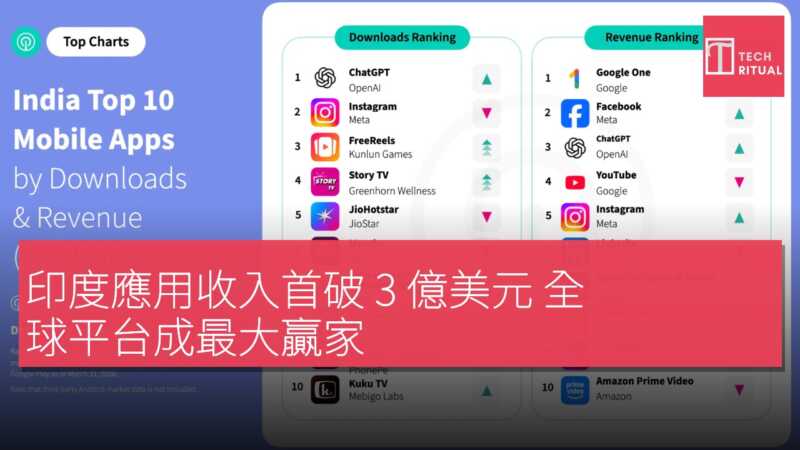 不過,在這場增長盛宴中,真正獲利最多的仍是全球性平台。Sensor Tower 數據指出,在 2026 年第一季度消費收入榜上,Google One、Facebook、ChatGPT 和 YouTube 等海外產品位列前茅,吸走了印度用戶的大部分增量。本土廠商則更多集中在視頻串流媒體賽道,如 JioHotstar 和 SonyLIV 等印度平台在收入排行中表現突出,但整體來看,全球平台依舊把握住主要變現通道。