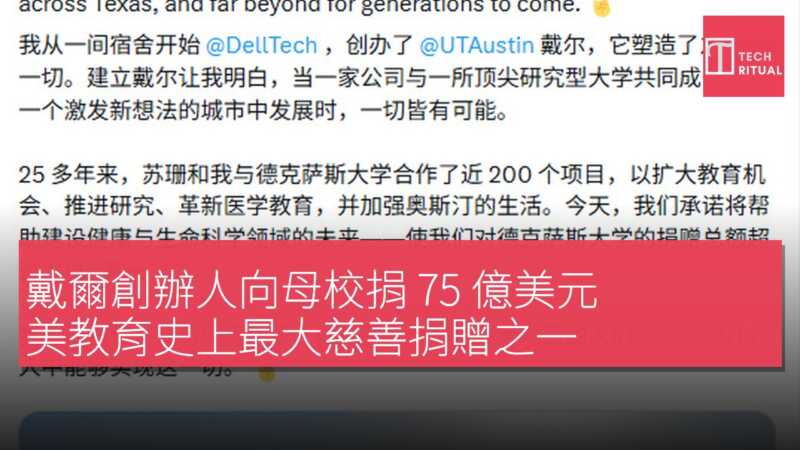 近日,Dell Technologies 創辦人 Michael Dell 宣佈向德克薩斯大學奧斯汀分校捐款 US$7.5 億,約 HK$58.5 億。這筆捐款是美國高等教育史上最大規模的慈善捐贈之一,將用於主校區興建生醫科學與學術醫學研究中心。截至目前,Dell 夫婦已向這所大學累計捐款總額超過 US$10 億。