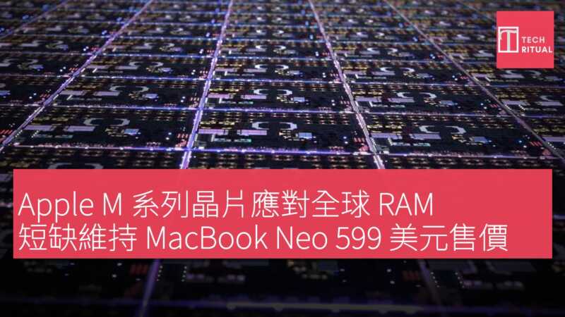 全球 RAM 短缺影響科技產品定價,Apple M 系列晶片憑藉系統單晶片(SoC)設計,有效管理記憶體使用。Apple 的統一記憶體架構及 macOS 積極壓縮機制,讓售價 US$599(約 HK$4,672)的 MacBook Neo 僅配備 8GB RAM 仍表現出色。相比之下,競爭對手如 Microsoft 因記憶體成本上升,將 Surface 系列價格上調高達 US$500(約 HK$3,900),Apple 的整合策略在危機中展現優勢。