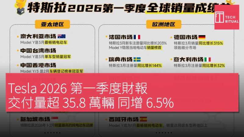 Tesla 發佈 2026 年第一季度財報。本季度全球生產總電動車 40.8 萬輛,同比增長 12.7%;交付量 35.8 萬輛,同比增長 6.5%。總營收 224 億美元,約 HK$1,747 億,同比增長 16%。 上海超級工廠第一季度交付 21.3 萬輛,同比增長 23.5%;3 月中國銷量 5.6 萬輛,環比增長 47%,Model Y 為中國乘用車銷量冠軍。