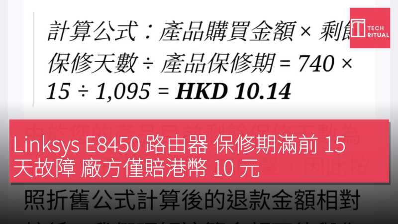 根據香港電腦商情 HKEPC 報導,一名香港消費者購買的 Linksys E8450 AX3200 路由器,在三年保修期滿前 15 天出現故障。廠方拒絕維修或更換,僅按剩餘保修天數折舊計算賠款 10.14 港元,而該路由器原價 740 港元。Linksys 的計算公式為:產品購買金錢 × 剩餘保修天數 ÷ 產品保修期,即 740 × 15 ÷ 1095 = 10.