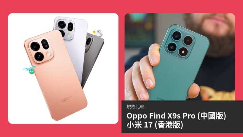 OPPO Find X9s Pro 則在電池容量(7025 mAh)、後置相機像素(雙 2 億像素)、錄影幀率及刷新率(144 Hz)領先,eSE NFC 實用,適合注重續航與遠攝的用戶。兩機各有優勢,小米 17 整體規格更均衡強勁,特別在香港版網絡相容性上勝出;若預算考量續航與中國應用,OPPO 是好選擇。