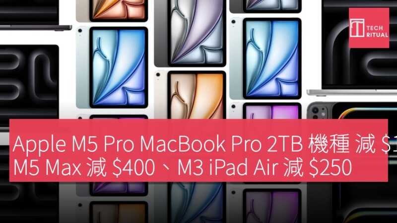 Apple M5 Pro MacBook Pro 2TB 機種 減 $170、M5 Max 減 $400、M3 iPad Air 減 $250