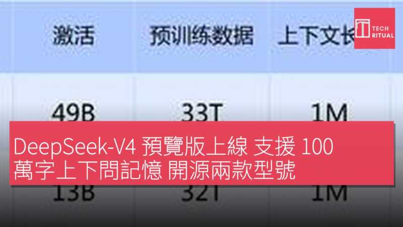 DeepSeek 正式推出全新系列模型 DeepSeek-V4 的預覽版本,並同步開源。該模型支援百萬字長度上下文中,在 Agent 能力、世界知識及推理性能上,平均達到現有國內與開源領域的領先水準。模型按大小分為 deepseek-v4-flash 及 deepseek-v4-pro 兩個版本。即日起登入官網或官方 App,即可對話最新 DeepSeek-V4,體驗 1M 字長度上下文的嶄新能力。