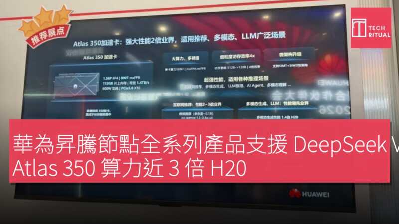 華為昇騰節點全系列產品支援 DeepSeek V4 模型,Atlas 350 算力近 3 倍 H20