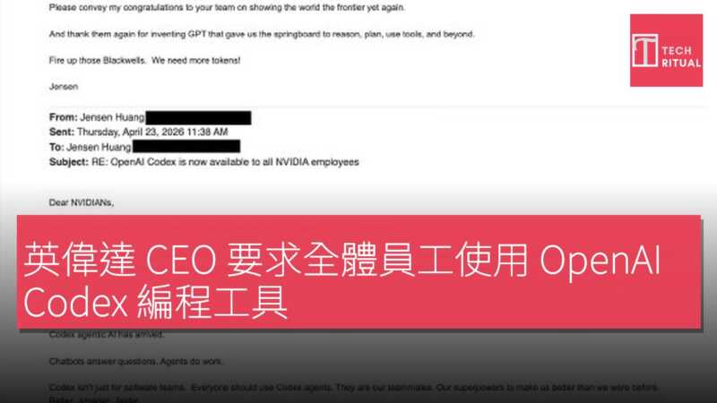 OpenAI 執行官方 Sam Altman 在社交平台分享了英國達 CEO 黃仁勳發給他的電郵。黃仁勳在電郵中附上他給英國達全體員工的電郵,要求他們使用 OpenAI 的 Codex 編程工具。黃仁勳在電郵中寫道:「親愛的英國達員工們,基於 GPT-5.5 的 OpenAI Codex 現已正式發佈,面向所有英國達員工開放!我們 10000 名員工——涵蓋工程、產品、法律、市場營銷、財務、銷售、人力資源、運營和開發項目等各個部門——已提前體驗,並已用它創造了許多令人驚嘆的成果。