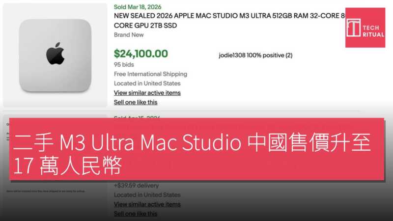 搭載 M3 Ultra 晶片的 Mac Studio 在二手市場價格已完全失控,512GB 統存版標價高達 US$25,000,約 HK$195,000。作為對比,配備 16TB SSD 的 256GB 版本在 Apple 官網售價約 US$12,000,同款機型庫存翻倍,價格直接翻倍以上。主要原因在於,Apple 預計將在未來幾個月發佈基於 M5 晶片的 Mac Studio 和 Mac mini,因此刻意減少了 M4 版本的生產量。