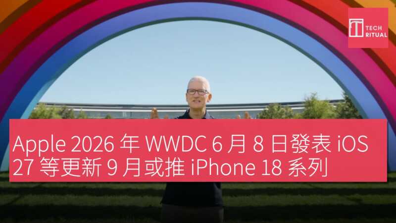 Apple 確認 2026 年 WWDC keynote 將於 6 月 8 日舉行,預計將公布 iOS 27、iPadOS 27 及 macOS 等系統更新,同時可能透露 AI 策略進展及部分 Mac 硬件。雖然 Apple 鮮有提前確認活動日期,但基於過往慣例及行業消息,9 月 iPhone 發佈會亦極有可能於 8 日或 9 日登場,屆時或推出 iPhone 18 系列、Apple Watch Series 12、Apple Watch Ultra 4,甚至傳聞中的摺疊 iPhone(iPh