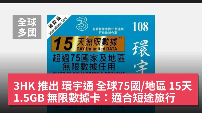 3HK 推出 環宇通 全球75國/地區 15天 1.5GB 無限數據卡:適合短途旅行
