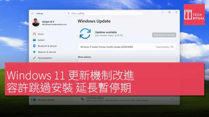 Microsoft正為 Windows 11 帶來一輪圍繞更新體驗的大規模調整,重點在於將更多決定權交還給用戶,包括在系統初始設定階段跳過更新、將更新暫停任期限長,以及在已有更新待安裝時仍可單獨選擇關機或重啟而非立即應用更新。相關改動目前已開始向 Windows Insider 測試用戶推送,其中包括 Beta 頻道的 Build 26220.8282,以及 Experimental 分支中 Canary 和 Dev 頻道的 Build 26300.