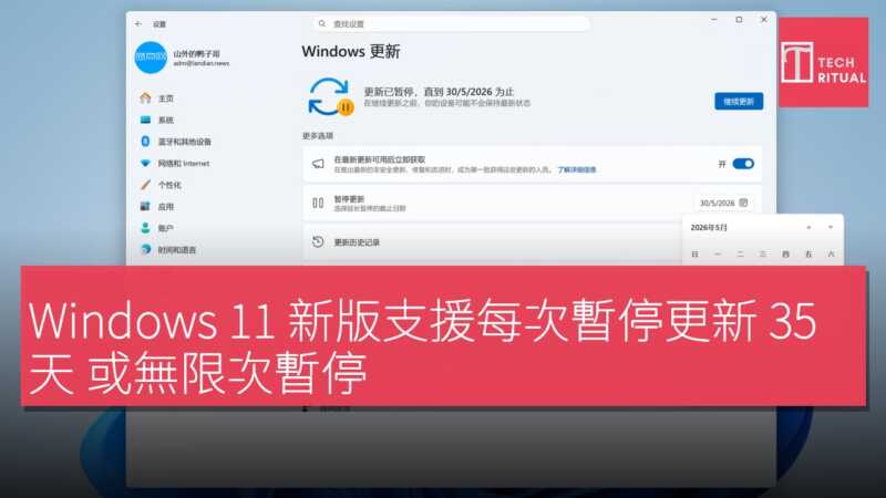 目前 Windows 11 正版中,用戶亦可暫停更新,但最多只限 4 週,之後系統會重新檢查更新並帶有強制性。只有系統完成安裝更新後,才能再次暫停更新。因此對普通用戶而言,每月需安裝更新,當然這些更新亦可能為系統帶來各種問題。Microsoft提供的全新選項是日期選擇器,用戶最多可選擇向後 35 天,選擇時間後系統便會暫停更新。與以往定期強制檢查更新不同,用戶可在 35 天暫停期內繼續向後延遲更新時間,最終達到無限期暫停更新的目標,只需最多 35 天手動更新日期。