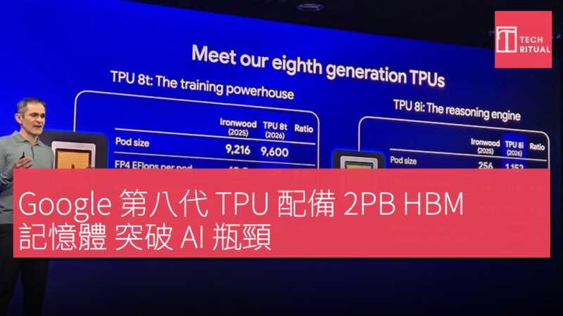 現存記憶體價格今年已上漲 3-5 倍,嚴重影響消費者對 PC 和手機的購買意欲,而這次記憶體大幅漲價的元兇正是 AI 需求過旺。大家都知道 AI 對記憶體(GPU 上運算顯存)的容量與頻寬要求極高,但實際能高到什麼程度?Google 前兩天發佈的第八代 TPU 就是最佳例證。 今年推出的 TPU v8 首次針對訓練與推論做了區分。V8T 偏重 AI 訓練,雖然 Google 表示也能做推論,但主要仍是訓練用途,每個 Pod 節點搭載了 9600 個 V8T 晶片,FP4 效能達 121 EFlo