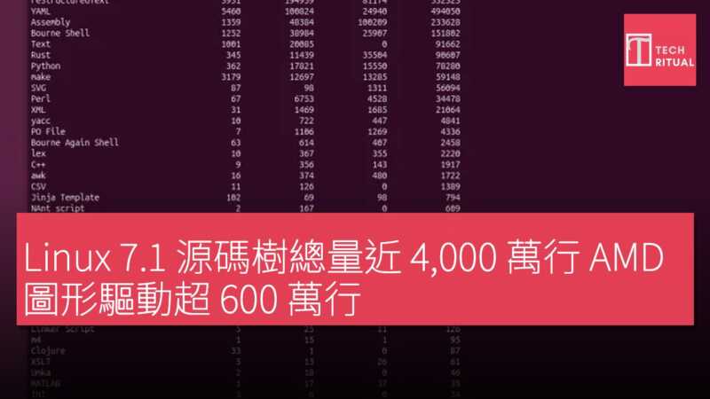 Linux 核心源碼總量正值近 4000 萬行。管理 Linux 7.1 合併窗口時,已移除大量過時驅動與舊平台支援代碼,但整體規模仍持續擴大,而 AMD 圖形驅動相關代碼亦已突破 600 萬行。在 Linux 7.1-rc1 版本預計於今日晚些時候發佈、Linux 7.1 合併窗口即將關閉之際,世人原關注大規模代碼移除是否會讓核心總代碼量較 Linux 7.