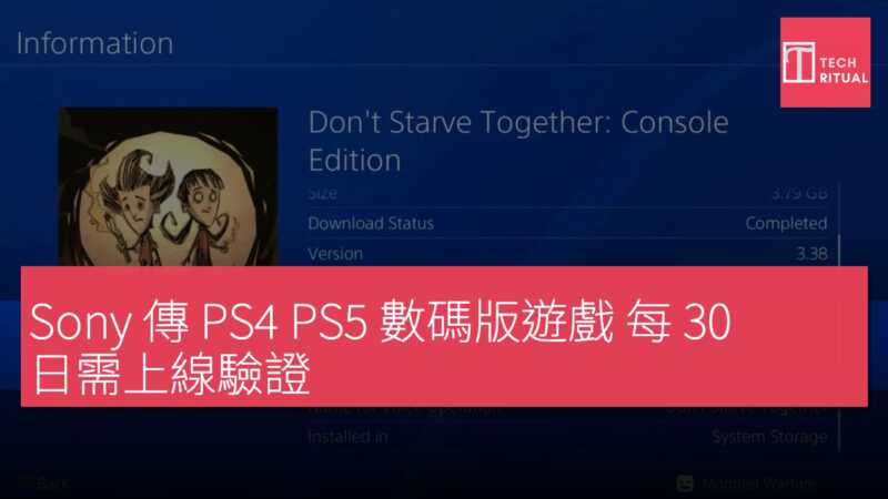 Sony 傳 PS4 PS5 數碼版遊戲 每 30 日需上線驗證