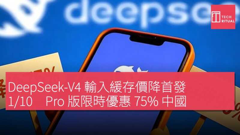 DeepSeek-V4 再度降價,全系列兩款模型輸入緩存中的價格直接降至首發價格的 1/10。最新調價後,DeepSeek-V4-Flash 每百萬 tokens 輸入(緩存中)價格為 0.02 元人民幣,約 HK$0.02;DeepSeek-V4-Pro 則為 0.025 元人民幣,約 HK$0.027。4 月 25 日晚間,DeepSeek-V4-Pro 宣布價格暴降 75%。