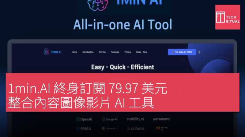 | 功能類別 | 主要工具 | |———-|———-| | 內容創作 | 部落格文章、摘要、關鍵字研究、社交標題 | | 圖像處理 | 生成圖像、編輯、移除背景、變體製作 | | 文件管理 | PDF 處理、翻譯、檔案洞察 | | 音頻 | 語音旁白、轉錄 | | 影片 | 文字/圖像轉影片、YouTube 總結 | 1min.AI Advanced Business Plan 終身訂閱現以一次性 US$79.