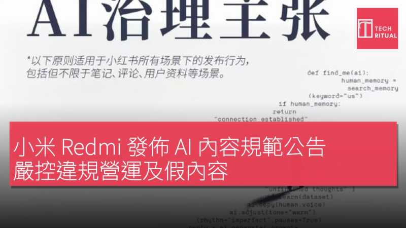 小米 Redmi 發佈 AI 內容管理規範公告。小米 Redmi 表示,「AI 讓創作變得更高效率,也讓傳播變得更便捷。偽造真人、批量生產內容、侵犯他人原創——這些行為消耗社會信任,是每一個認真做內容的人換來的不公。小米 Redmi 正式發佈 AI 內容管理規範,明確平台立場與管理邊界。真摯創作的人,值得被看見、被保護。」