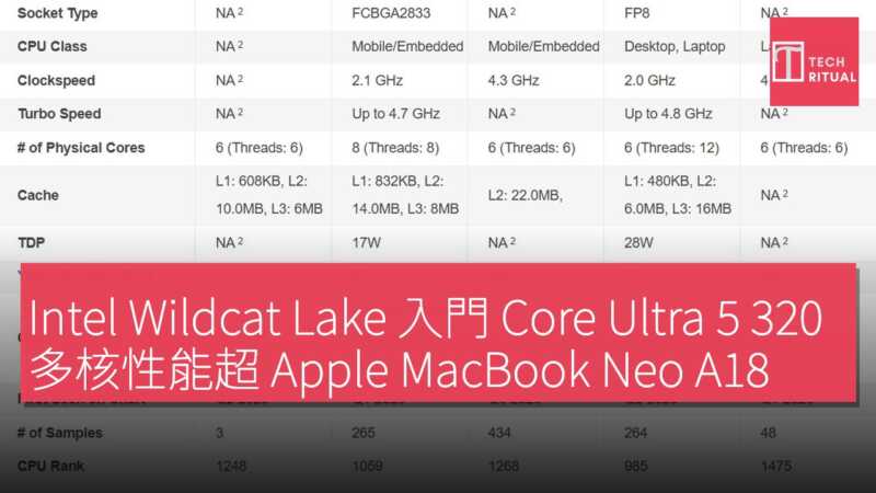 Intel Wildcat Lake 架構入門級處理器 Core 5 320 近日在 PassMark 平臺完成性能實測,其多核性能比蘋果 MacBook Neo 搭載的 A18 Pro 晶片高出 27%,單核性能基本持平。這款 6 核晶片專為平價輕薄本設計,包含 2 顆高性能核心與 4 顆效能核心,其中性能核最高主頻達 4.6GHz,效能核最大主頻為 3.4GHz。
