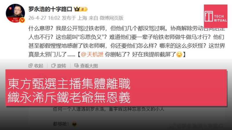 近日,有網友發帖指任何人都可能遇到像董宇輝那種「忘恩負義」的小人。針對此番言論,董宇輝在社交平台回應:「什麼意思?我公開罵過鐵老帥,他們幾個也沒罵過啊。解散團隊後走人也叫忘恩負義?這也能叫『忘恩負義』?」他直言,「難道他們要一輩子給鐵老帥做牛做馬才行?他們甚至虛偽地感謝了鐵老帥啊,你還要他們怎麼樣?哪來的這麼多刁鑽?這世界真是太邪門了……」近期,東方甄選主播離職風波持續發酵。