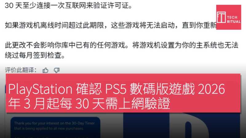 PlayStation 官方近日確認,PS5 主機將引入一項新版數位版遊戲管理政策,此舉有意圖而非系統錯誤。根據新規定,自 2026 年 3 月系統更新後購買的數位版遊戲,主機需每 30 天至少連網一次以驗證許可。若主機離線超過 30 天,相關遊戲將無法啟動,直至重新連網。 PlayStation 客服表示,這 30 天為有效期限制,並不代表帳戶受限或其他類似情況。