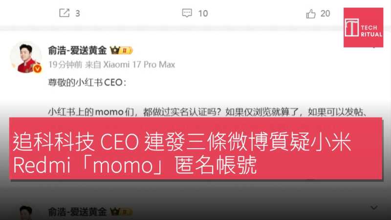 追蹤科技創始人兼 CEO 張濤連發三條微博,直指小米 Redmi CEO,針對小米 Redmi 平台上大量「momo」帳號現象提出質疑。他表示:「momo 是誰?為什麼那麼多 momo?momo 發佈了不實虛假信息,對我們造成了負面影響,我該找誰?找你這是找 momo?」他指出,小米 Redmi 上的 momo 們,是否做過實名認證?如果瀏覽就算了,如果可以發帖、留言、評論,為什麼不實名認證。