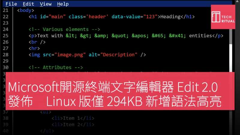Microsoft去年前開源的命令行文字編輯器 Edit 推出 2.0.0 版本更新,新增加法高亮功能,Linux 版本體積僅 294KB。Edit 2.0 最大變化是加入語法高亮支援,涵蓋純文字、Diff、GitHub Commit/Rebase、Ignore、JavaScript、JSON、LSH、Markdown、PowerShell、Properties、Python、Shell、Script、XML 和 YAML 等多種語言,並支援自動辨識。