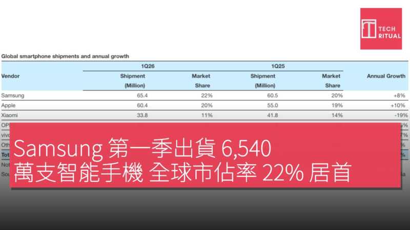 Samsung 在全球智能手機市場主導多年後,去年失守冠軍寶座予 Apple,但今年第一季成功反彈,重奪首位,主要歸功於早前發佈的 Galaxy S26 系列強勁表現。根據研究機構 Omdia 最新數據,Samsung 在 2026 年第一季出貨量達 6540 萬部智能手機,市佔率 22%,較去年同期增長 8%。
